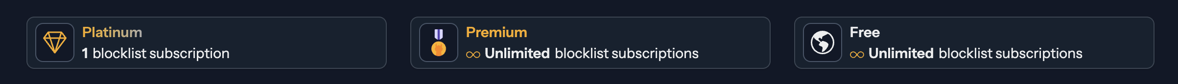 To view and manage your active blocklist subscriptions, navigate to the Subscriptions menu in the Blocklists tab. This section provides an overview of all currently subscribed blocklists, allowing you to track and update your subscriptions as needed.